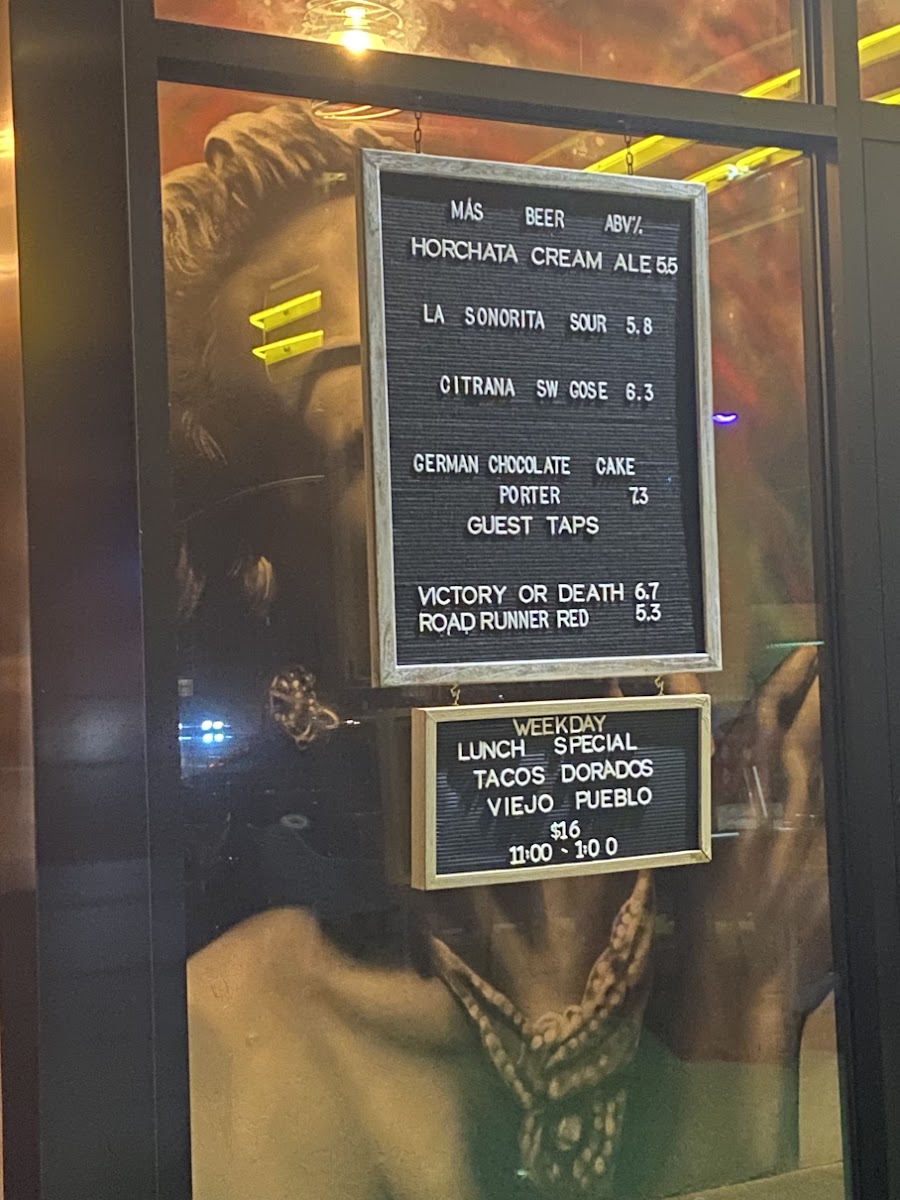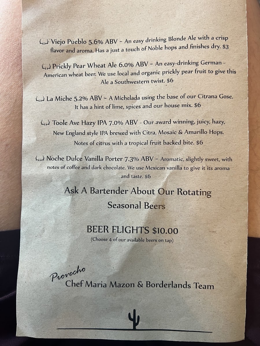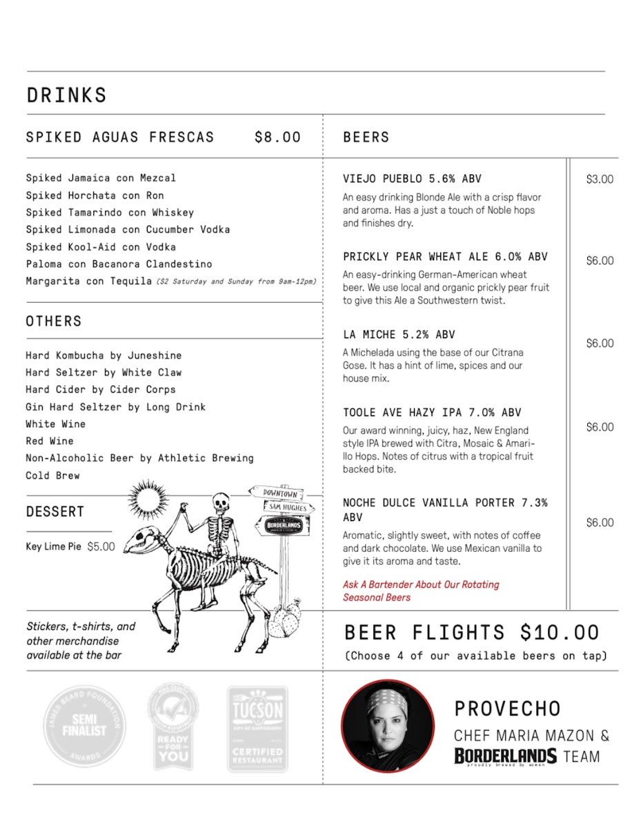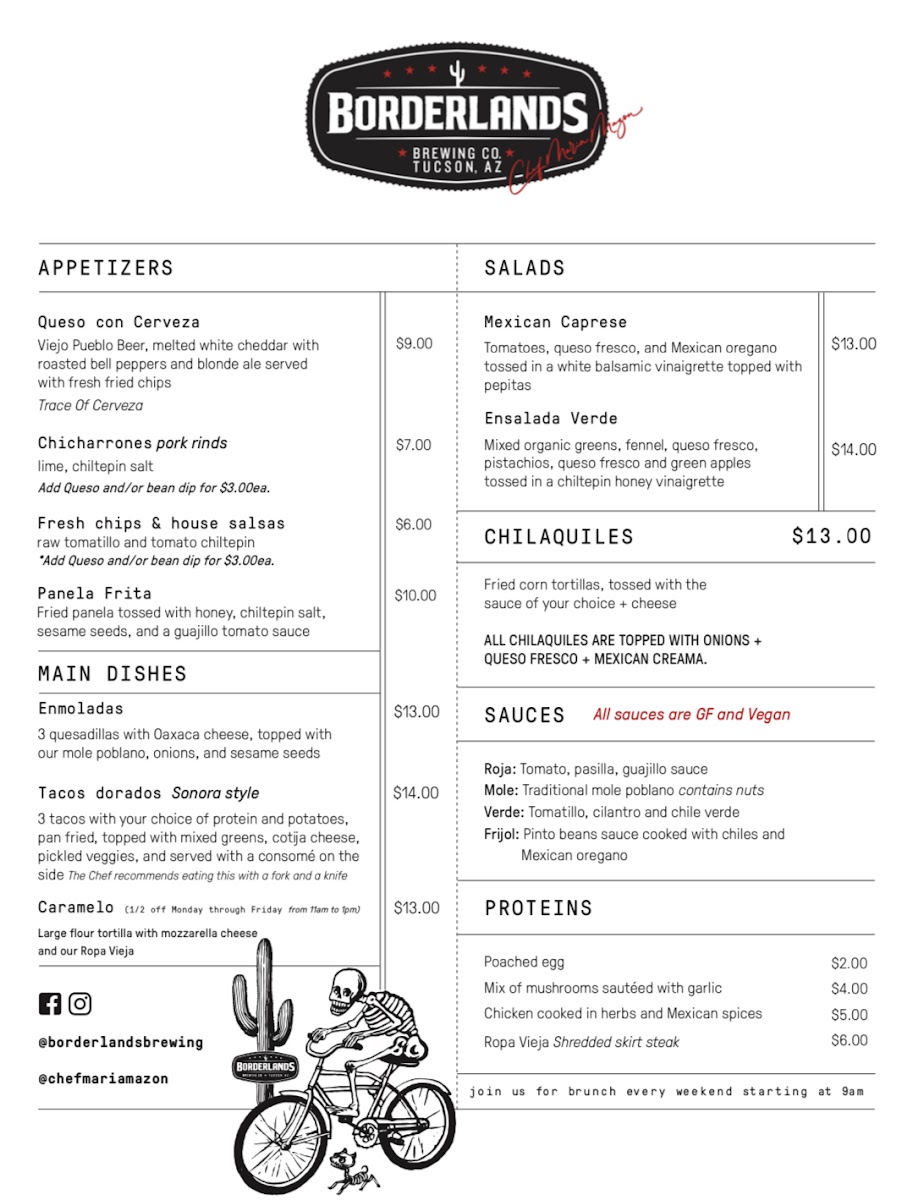 The menu at Borderlands Brewing Sam Hughes offers a diverse and flavorful range of dishes, perfect for a casual yet satisfying dining experience. For appetizers, you can indulge in the rich Queso Con Cerveza or crispy Chicharrones Pork Rinds, both ideal for sharing. The Fresh Chips & House Salsas offer a light option, while the Panela Frita provides a savory fried cheese dish. When it comes to main dishes, the Enmoladas offer a unique take on traditional Mexican flavors, while the Tacos Dorados Sonora Style deliver crispy goodness. The sweet Caramelo provides a delightful balance. For lighter fare, you can choose from the Mexican Caprese or Ensalada Verde salads. A variety of sauces like the creamy Frijol add an extra layer of flavor to any dish. To accompany your meal, you can enjoy refreshing Spiked Aguas Frescas such as Spiked Jamaica Con Mezcal or Spiked Tamarindo Con Whiskey, or try a hard kombucha like Juneshine. For beer lovers, the menu offers local brews like the Viejo Pueblo (5.6% ABV) and the Noche Dulce Vanilla Porter (7.3% ABV). If you're in the mood for wine, there are options for both White and Red Wine. Don't forget to end your meal with a tangy slice of Key Lime Pie for dessert. Whether you're in the mood for something light or hearty, the Borderlands Brewing Sam Hughes menu has something to satisfy every craving.